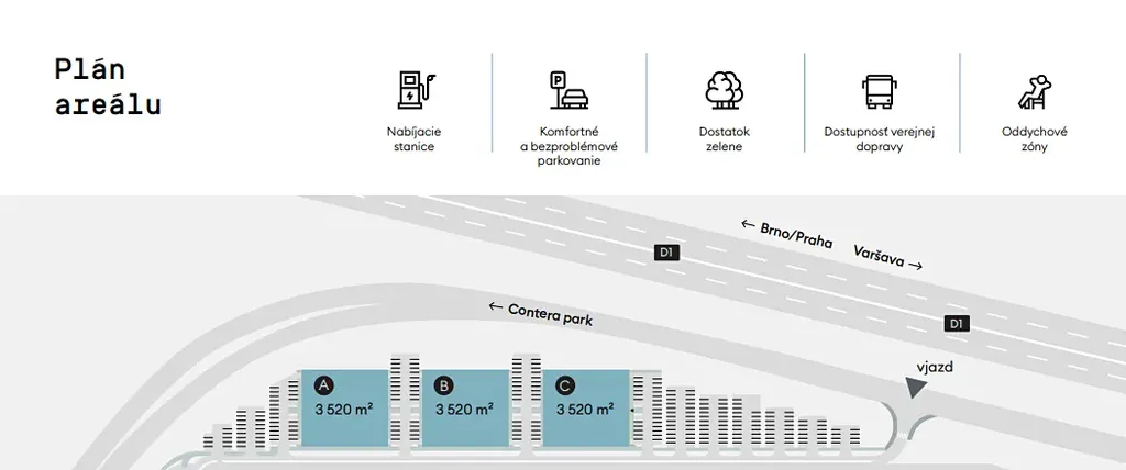 K dispozici jsou prostory od 500 m2 do 10560 m2. Komfortní a bezproblémové parkování je přímo před prostory. K dispozici jsou i nabíjecí stanice a také dostupnost veřejné dopravy.