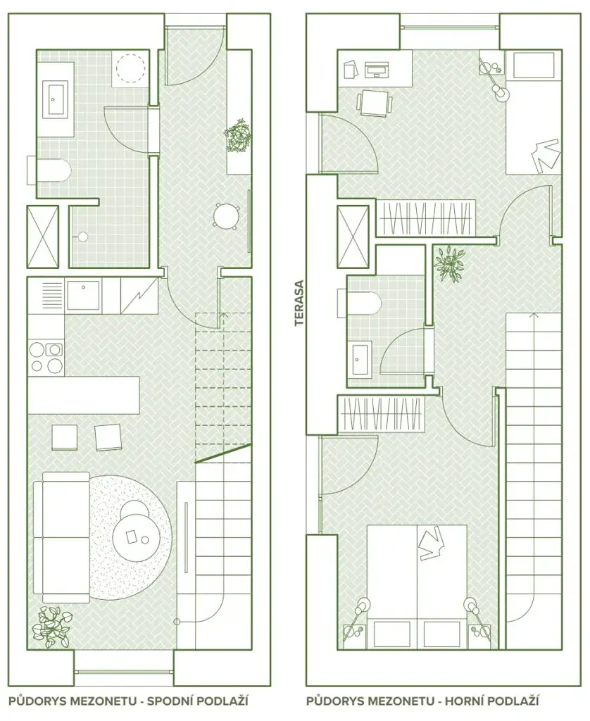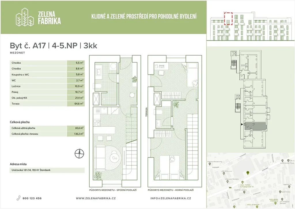 Nabízíme mezonetový byt 3+kk o užitné ploše 65,6 m² ve 4.–5. nadzemním podlaží (byt A17) s velkorysou terasou 64,6 m² v rámci 3. etapy projektu Zelená Fabrika ve Šternberku.