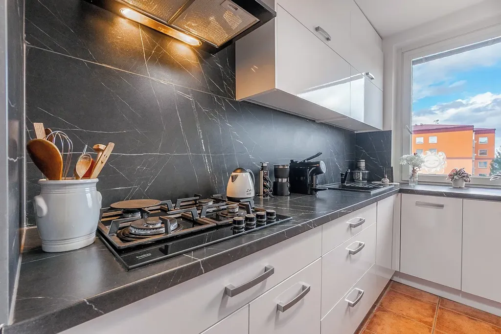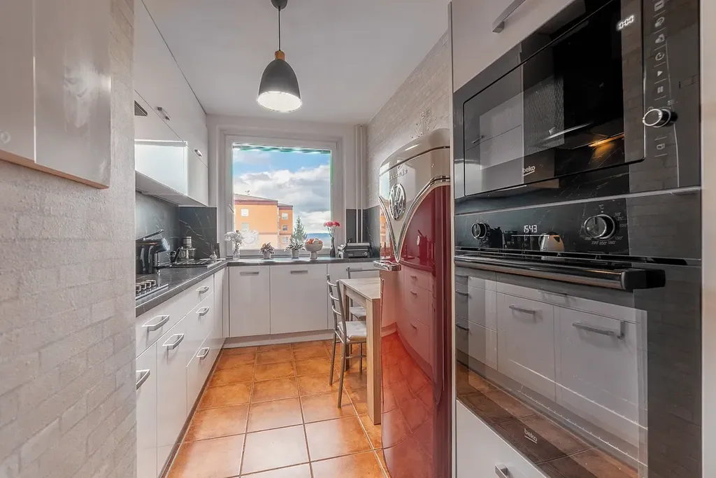 Byt se nachází v pátém patře zatepleného domu s výtahem, což zaručuje pohodlí a snadný přístup. Nedávno a s velkou péčí prošel kompletní rekonstrukcí, při které byly vyměněny zdi i podlahy, a v kuchyni se nachází nová kuchyňská linka, která disponuje dostatkem úložného prostoru a moderními spotřebiči.