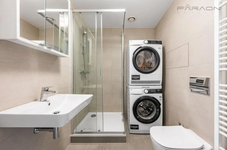 Vybavení dle fotodokumentace, tj. kompletně zařízená kuchyňská linka všemi spotřebiči, koupelna se sprchovým koutem a toaletou, velká šatní skříň v chodbě, nová pračka a sušička, rekuperace.
