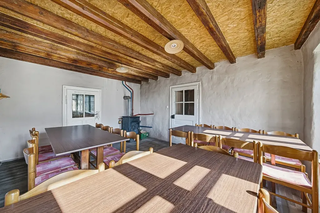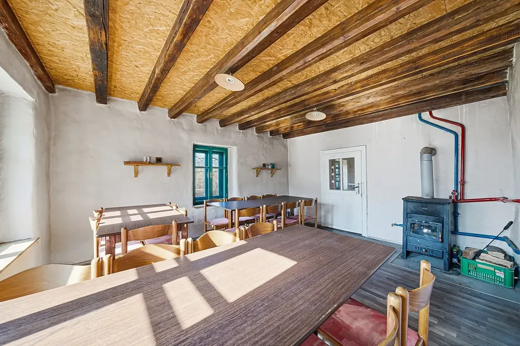 vytápění: krbová kamna s výměníkem a rozvodem do radiátorů po celé chatě