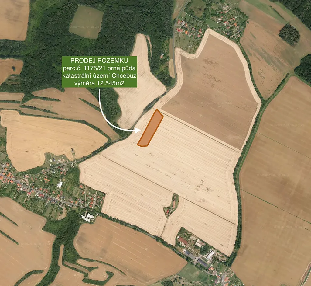 Nabízíme ke koupi pozemek orné půdy o celkové výměře 12.545m2 nacházející se v katastrálním území Chcebuz zapsaný na listu vlastnictví č. 49. Pozemek je využívaný jako orná půda a je pronajatý místnímu hospodáři do na dobu neurčitou s jednoletou výpovědní lhůtou.