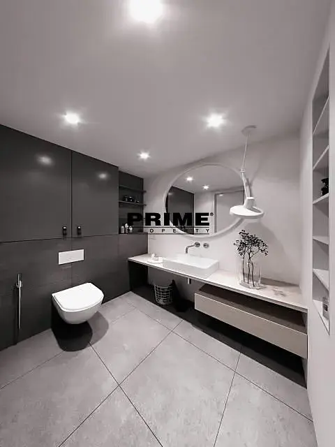 Byt je zařízený. Dispozice bytu: vstupní hala, obývací pokoj s balkonem, samostatná kuchyň s jídelní částí a s plně vybavenou moderní kuchyňskou linkou se všemi spotřebiči, hlavní ložnice se šatnou a koupelnou (vana, 2 umyvadla, toaleta), druhá ložnice, druhá koupelna (sprchový kout, umyvadlo, toaleta, bidet) a komora.