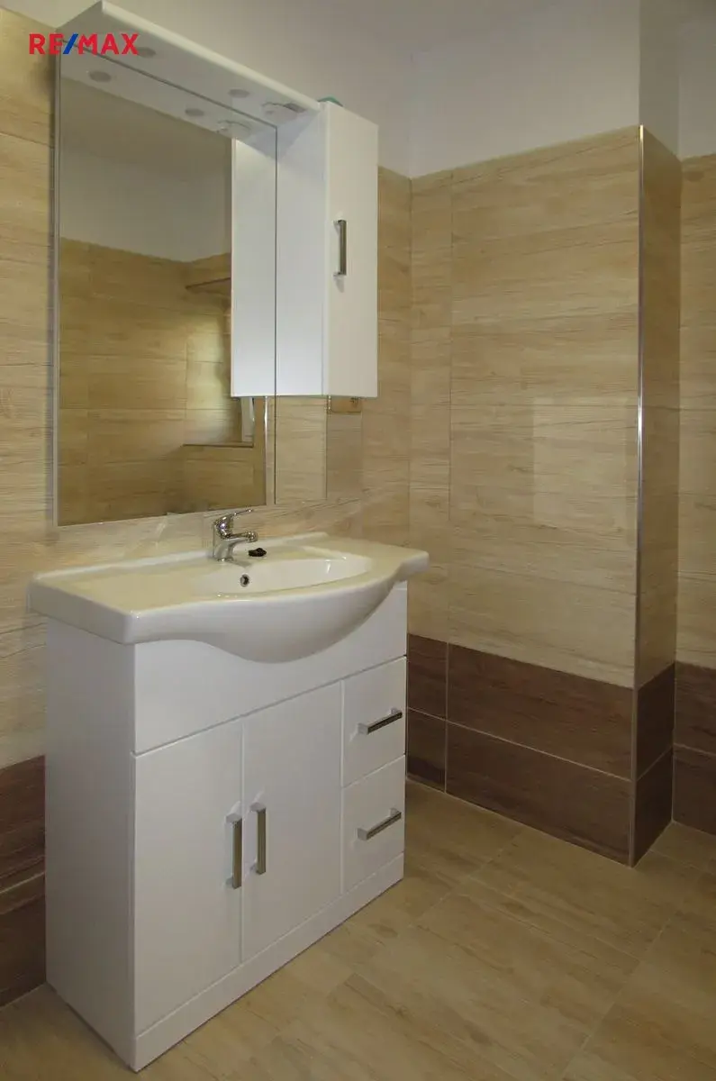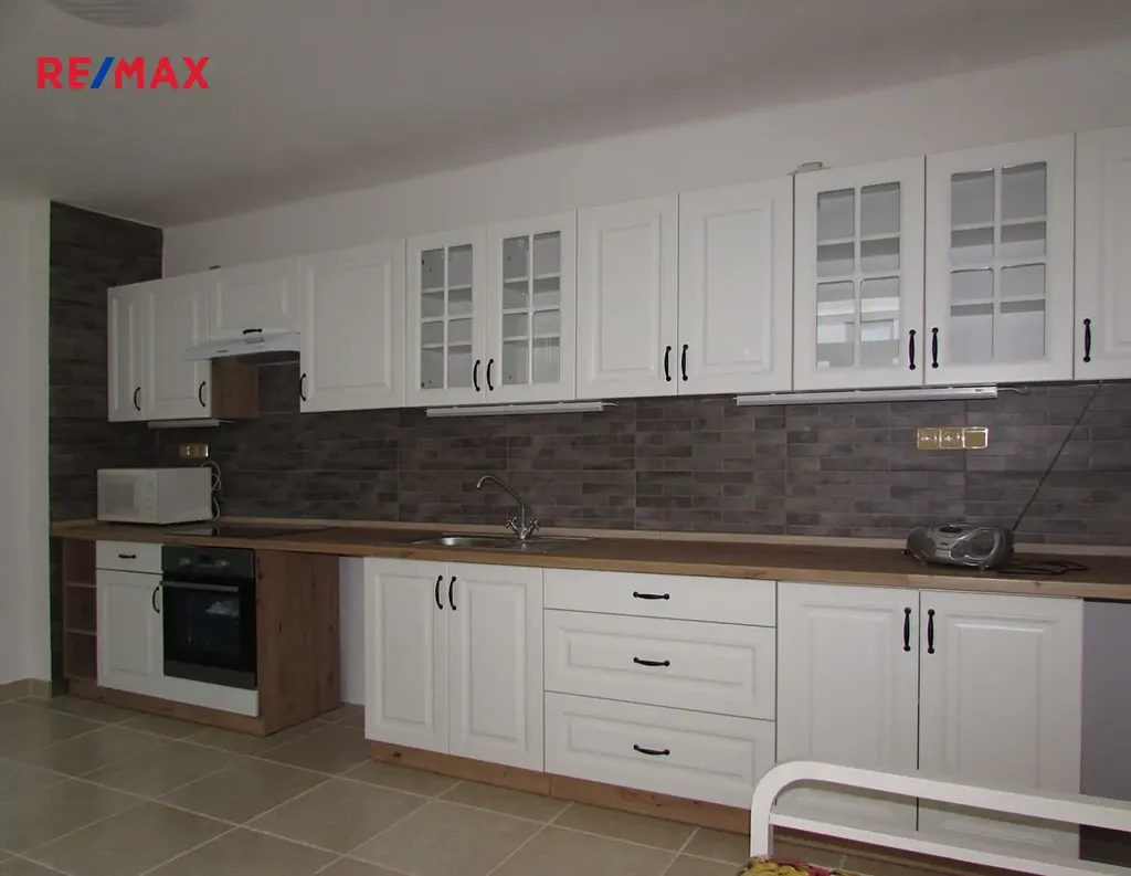 Kuchyňská linka je nová, vybavena vestavěnými spotřebiči, vest. troubou a el. indukční varnou deskou, odsávačem par, dřezem s baterií a mikrovlnnou troubou. Je zde příprava případně i pro myčku nádobí.