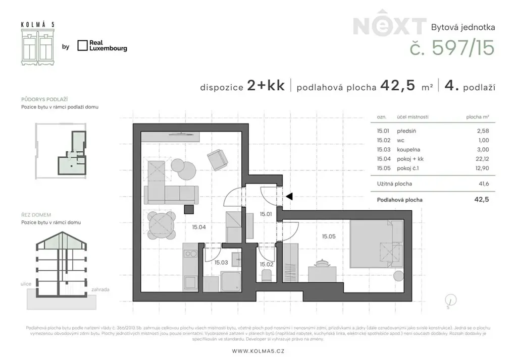 Tato konkrétní jednotka č.15 o dispozici 2kk a podlahové ploše 43 m2 se nachází ve 4 nadzemním podlaží s výhledem jak do ulice, tak do zahrady. Je členěna na vstupní chodbu, samostatnou toaletu, obývací pokoj s kuchyňským koutem, ze kterého je přístup do koupelny a oddělenou ložnici. Přesné rozložení si můžete prohlédnout na přiloženém půdorysu. Vytápění je řešeno elektrickými přímotopy a ohřev vody elektrickým bojlerem.