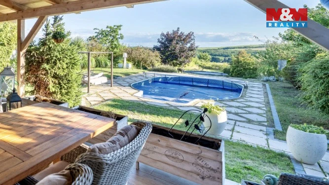 Na zahradě vás čeká nejen bazén pro letní osvěžení, ale i vlastní studna – praktický prvek, který přináší nezávislost a komfort.