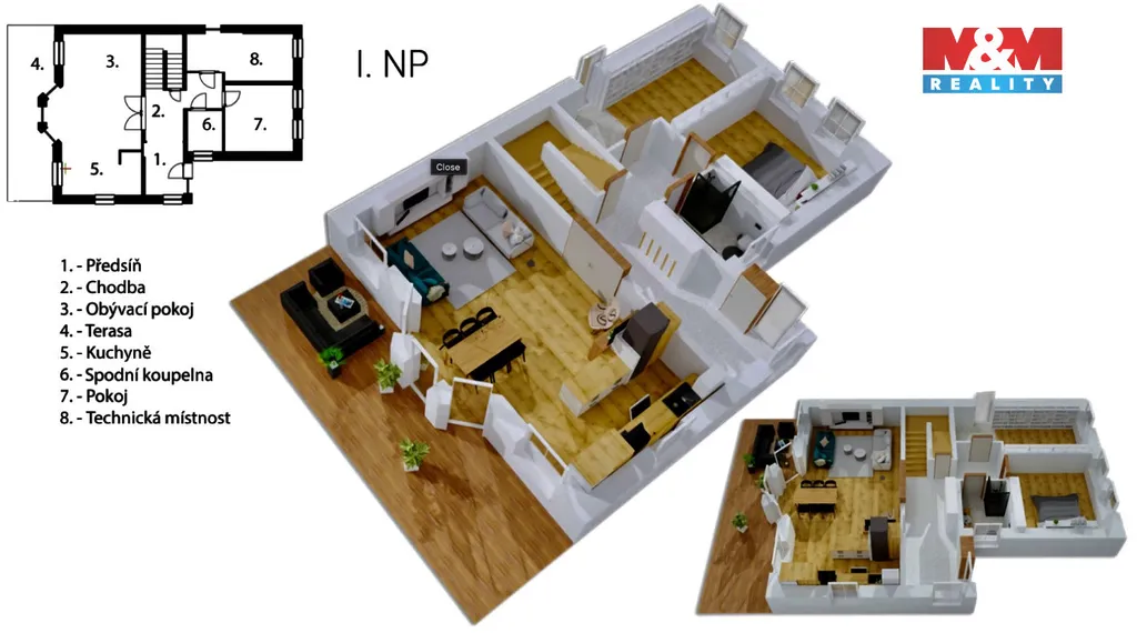Dominantou domu je velkorysý, otevřený obytný prostor s kuchyní, který působí vzdušně a přirozeně propojuje interiér s exteriérem. Odtud vstoupíte na zastřešenou terasu o přibližně 50 m² – ideální místo pro stylové letní večery, rodinné oslavy i klidné chvíle s výhledem do zeleně.