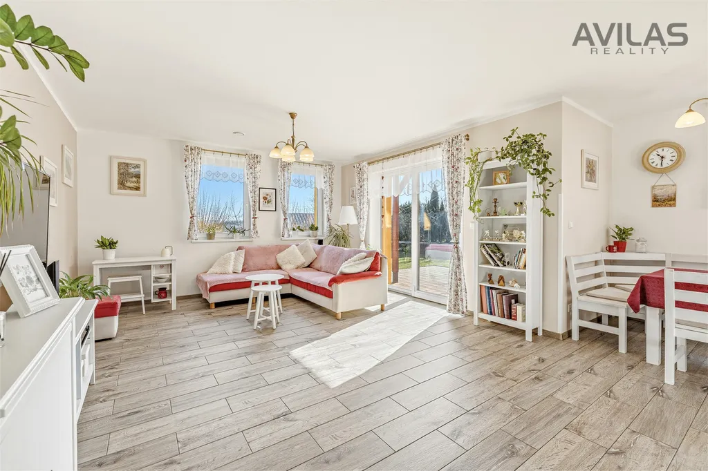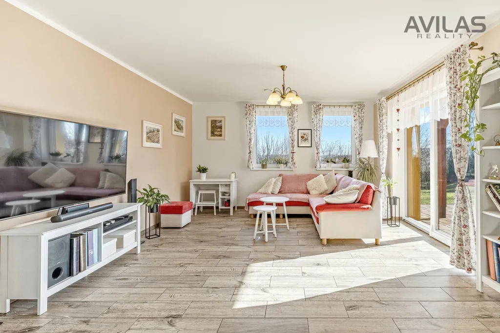Dominantou domu je světlý obytný prostor s kuchyňským koutem, který plynule navazuje na zahradu. Dispozice dále nabízí tři samostatné pokoje, koupelnu, samostatné WC, technické zázemí a vstupní zádveří.