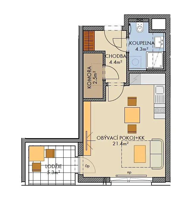 V koupelně sprchový kout, topný žebřík a závěsné WC, dále interiérové dveře, plastová okna, vinylová podlaha a dlažba, protipožární vchodové dveře. K dispozici komora v bytě.
