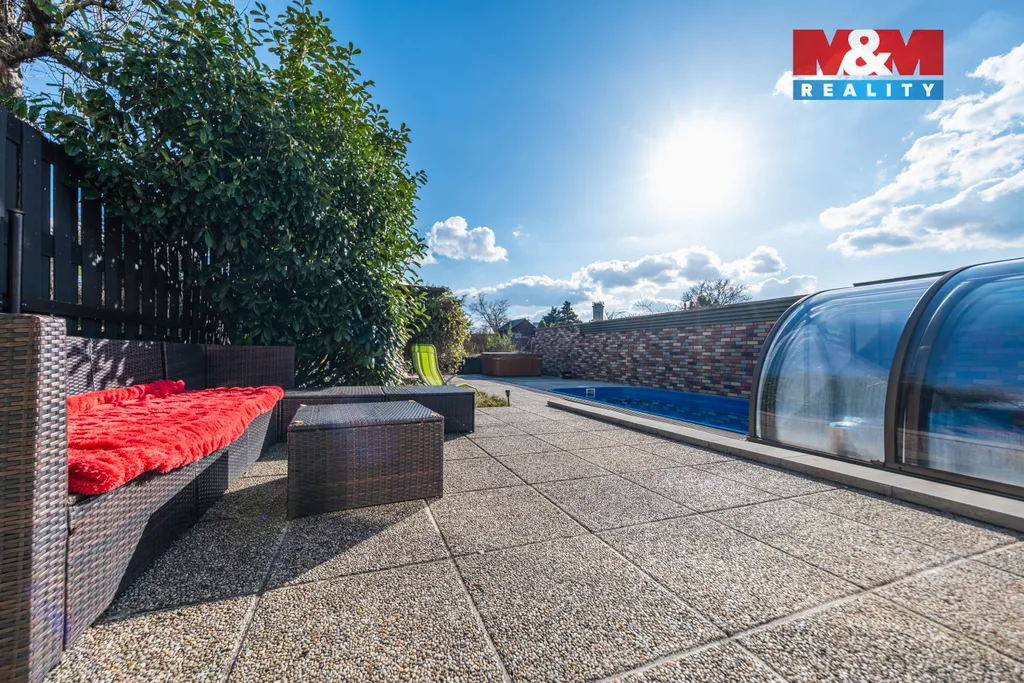 Zahrada o velikosti 370 m² nabízí krytý vyhřívaný bazén se slanou vodou, pergolu a prostor připravený pro zahradní domek. Terasu chrání elektrická markýza. Součástí domu jsou také solární panely s bateriemi, které přispívají k nízkým měsíčním nákladům i při celoročním provozu bazénu. Garáž pro dvě auta a další parkování je samozřejmostí. PENB: B.