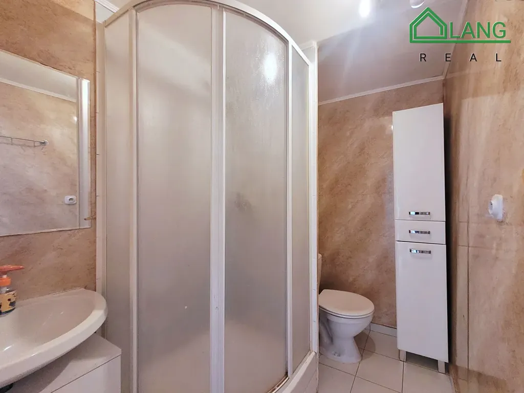 Koupelna s toaletou je vybavena sprchovým koutem, a úložnými prostory.