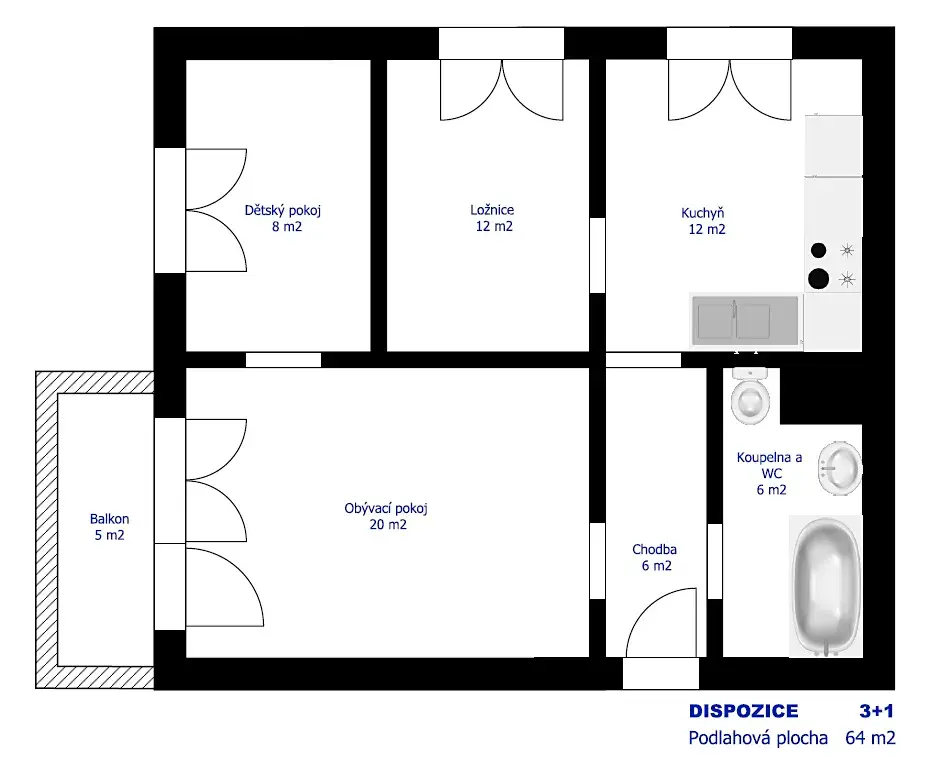 Dispozici bytu tvoří vstupní chodba, koupelna s vanou a toaletou, obývací pokoj se vstupem na zasklený balkon, ložnice, kuchyň s jídelním koutem a dětský pokoj. Vytápění bytu je řešeno dálkovým ústředním topením.