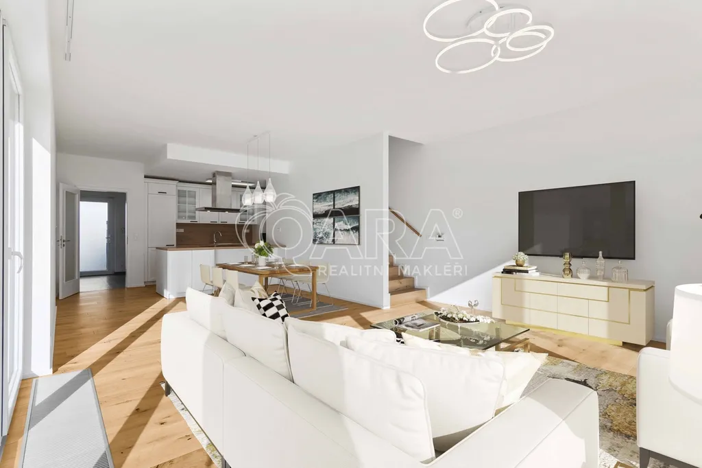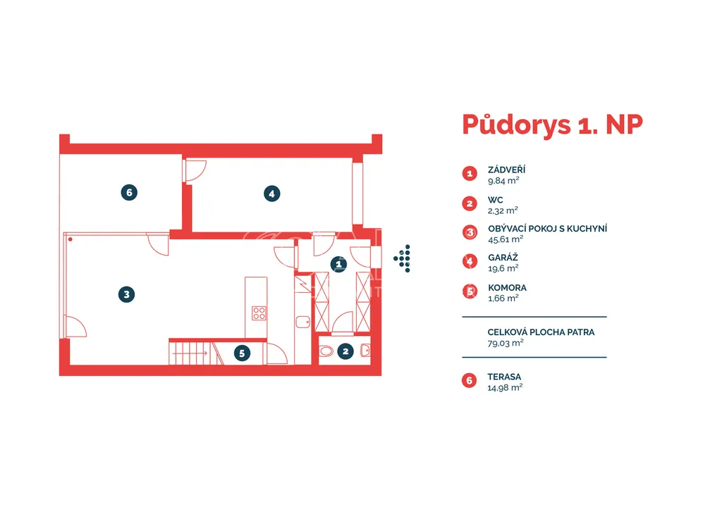 První nadzemní podlaží tvoří předsíň (s vestavnými skříněmi), samostatná toaleta a prostorný obývací pokoj (45,61 m2) s kuchyňským koutem a praktickou komorou. Moderní kuchyňská linka je vybavena kvalitními vestavnými spotřebiči: lednicí s mrazákem, myčkou, horkovzdušnou troubou s indukční varnou deskou a digestoří. Z obývacího pokoje vede přímý vstup na první terasu a zahradu s jižní orientací. Instalována velkoformátová plastová okna s venkovními žaluziemi.