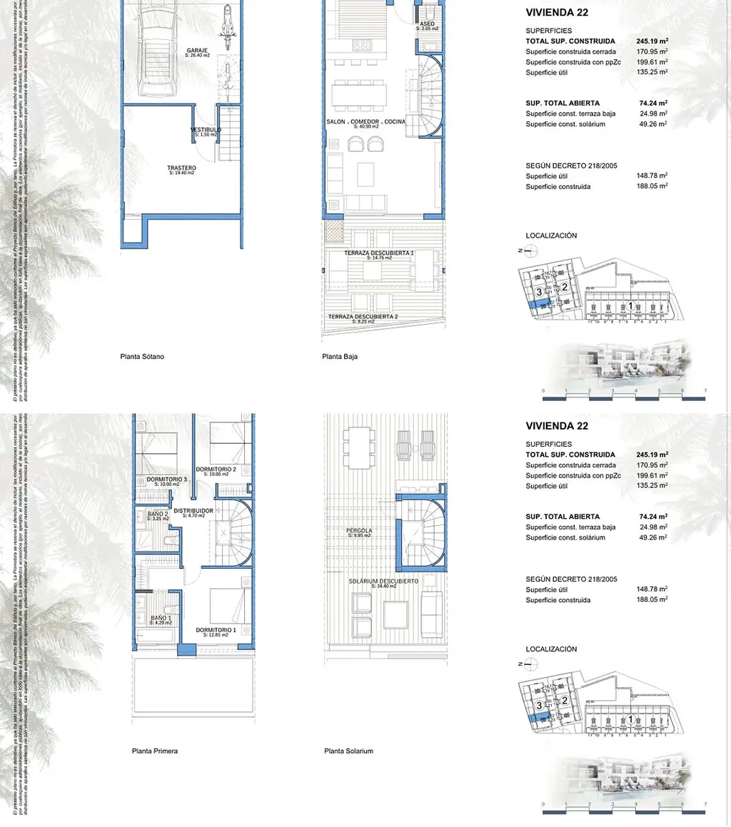 V horním patře jsou situovány tři ložnice a dvě koupelny, které poskytují dostatek soukromí pro rodinné bydlení. Dominantou každého domu je střešní solárium, které nabízí ideální prostor pro relaxaci a zároveň otevřené výhledy do okolí a směrem k pobřeží.