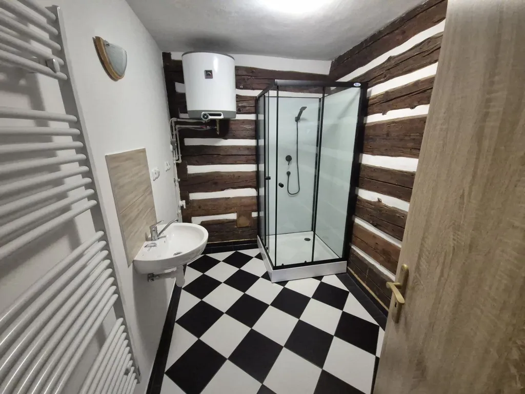 První byt zaujme kombinací dřevěných podlah z masivních prken a charakteristické černo-bílé šachovnicové dlažby, doplněné odkrytým dřevěným trámem na stropě. Součástí je nová kuchyňská linka s elektrickým sporákem, troubou a digestoří a koupelna se sprchovým koutem, umyvadlem a žebříkovým radiátorem.