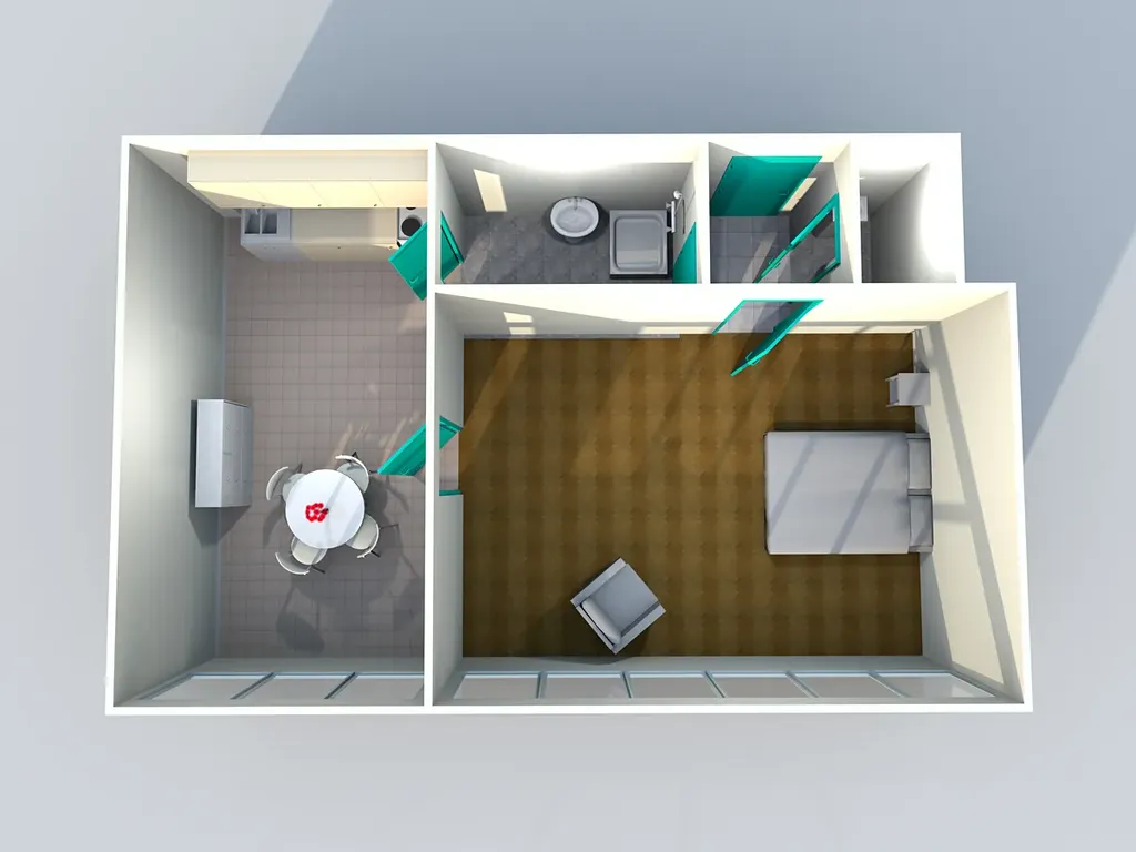 Pokoj má plochu 20m2, obytná kuchyň 16m2, koupelna 4,4m2, předsíň 2,3m2, WC 1,5m2.