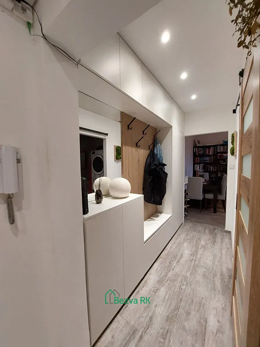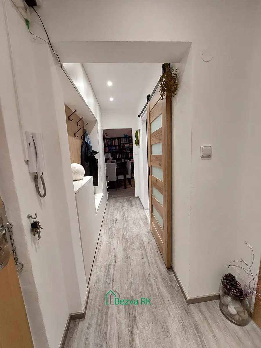 Dispozice bytu byla před dvěma roky přestavena na 2+kk, zároveň v bytě proběhla kompletní rekonstrukce (elektroinstalace, nové vinylové podlahy v obývacím pokoji, dlažba v chodbě a kuchyni). Vstupní chodba poskytuje dostatek úložného prostoru a umožňuje vstup do všech místností. Srdcem bytu je světlý obývací pokoj s kuchyňským koutem, který nabízí přímý vstup na lodžii. Mezi další prostory patří ložnice, která nabízí přímý vstup na druhou lodžii. Také zděná koupelna s toaletou a sprchovým koutem prošla kompletní rekonstrukcí před dvěma roky ( obklady, dlažba, rozvody vody). Předností je velká komora v bytě. K bytu patří sklípek v suterénu bytového domu. Ohřev vody a vytápění zajišťuje tepelné čerpadlo.
