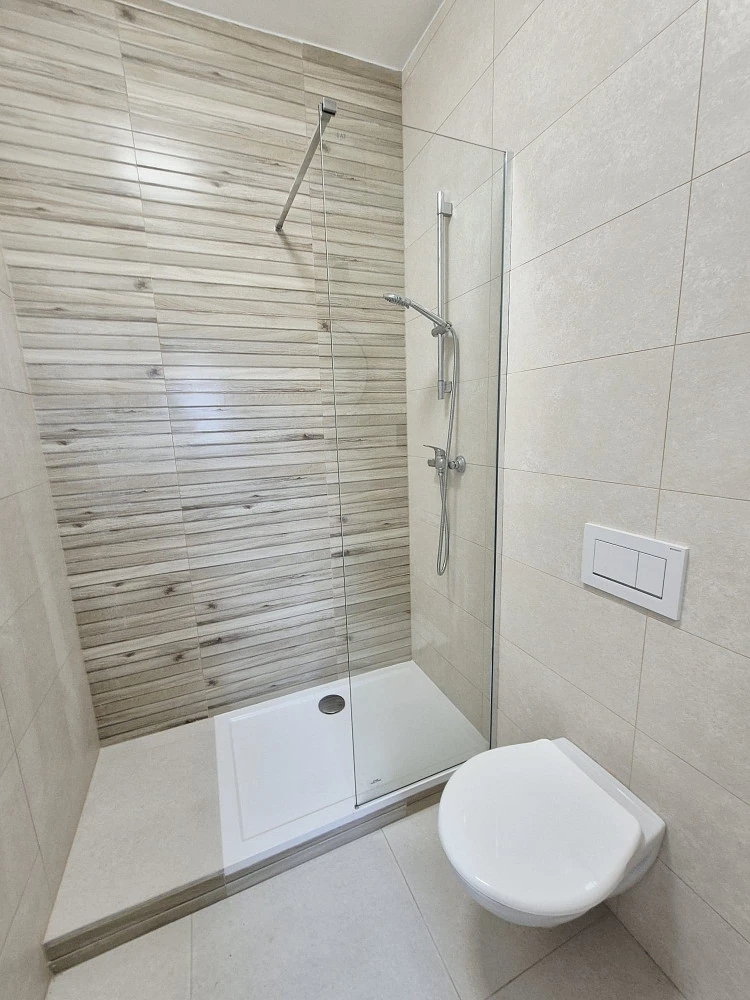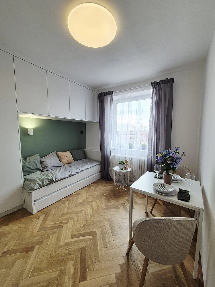 Byt je po kompletní rekonstrukci navržené architektkou (březen 2026) a je plně zařízen (kuchyňská linka s varnou deskou, pračka se sušičkou, vestavná lednice, mikrovlnná trouba, dále rozkládací postel, jídelní stůl, v předsíni a obytné kuchyni nábytek – dostatek úložných prostor).