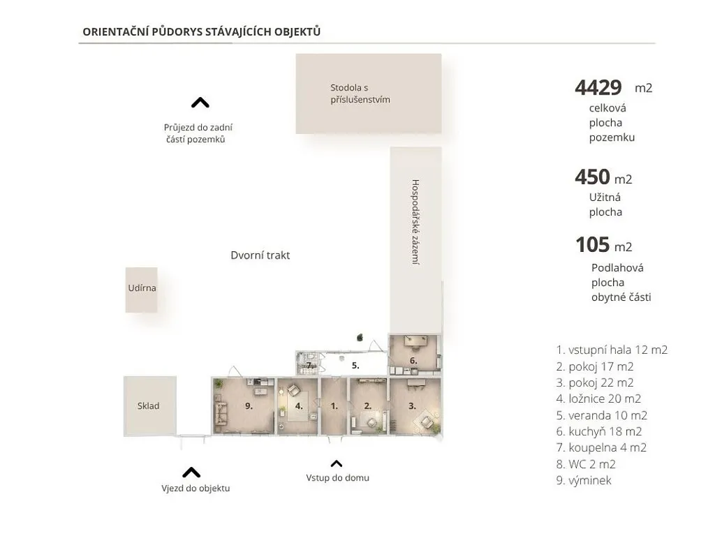 Cena nemovitosti zohledňuje především hodnotu plně zasíťovaného stavebního pozemku v této lokalitě a výměře. Stávající stavby statku jsou bonusem pro ty, kteří hledají místo pro svůj životní projekt nebo investici s jasnou budoucností.