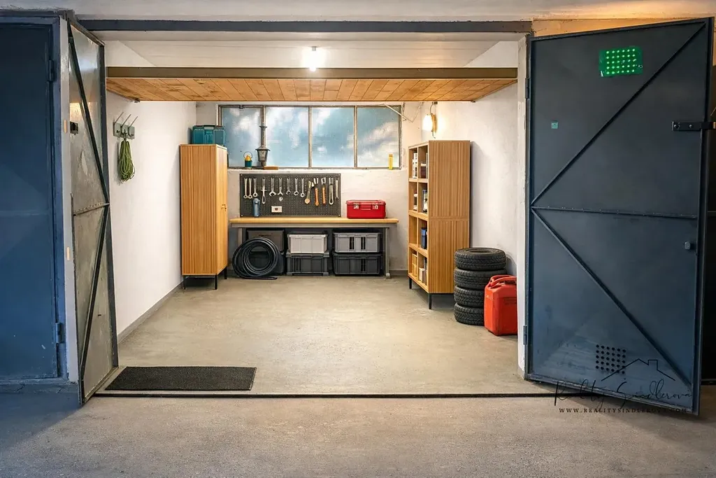 Samotná garáž je v dobrém stavu, dveře plechové, podlaha betonová, k dispozici regály a skříně (je možné je odstranit).