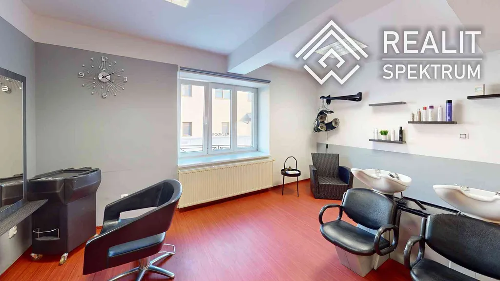 Provozní část (28 m²), kadeřnictví vybavené a připravené k provozu. Ideální pro živnosti peče o tělo (kadeřnictví, holičství, kosmetika, pedikúra, manikúra, masáže) nebo kancelářské práce + zázemí (sociální zařízení, úklidová místnost, chodby)