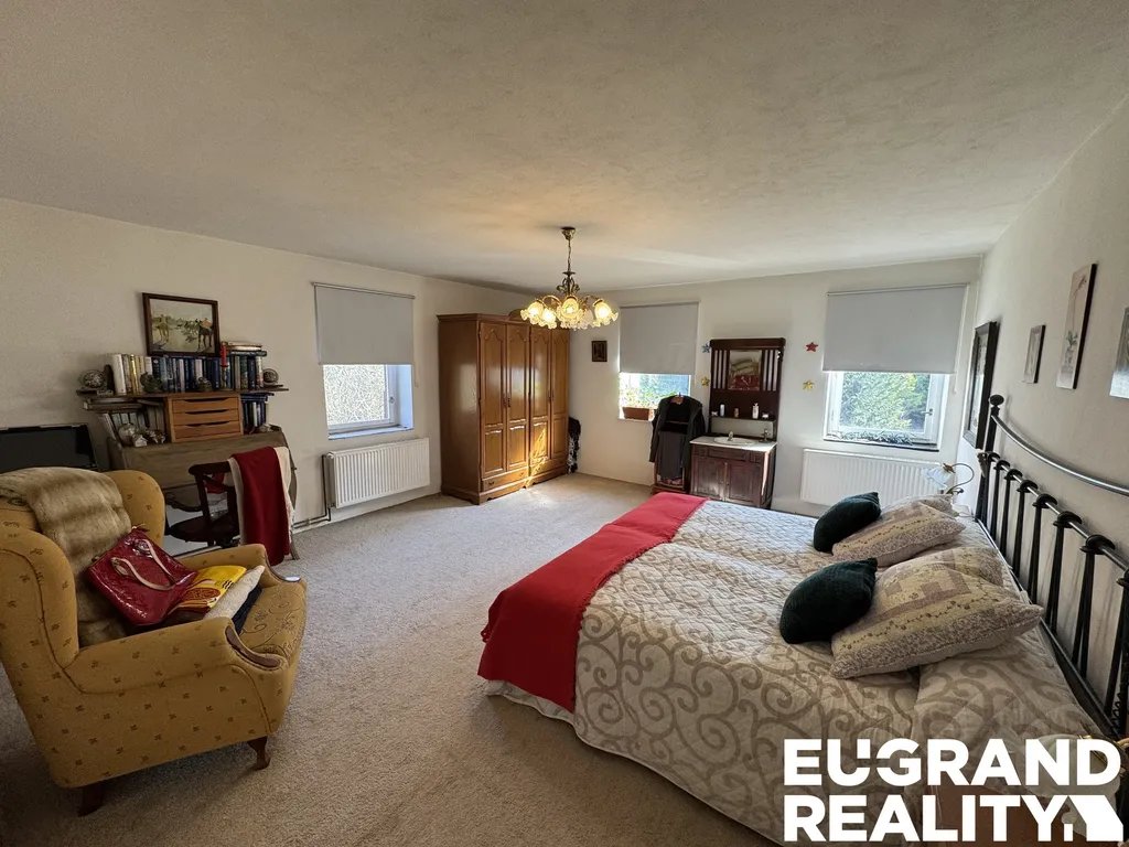 V patře jsou k dispozici dvě nadstandardně prostorné ložnice, přičemž jedna z nich má vlastní šatnu. Dále zde najdete třetí menší pokoj, koupelnu s WC a vstup na půdu.