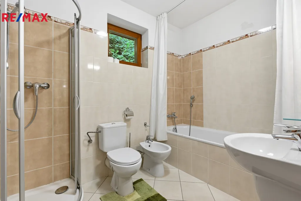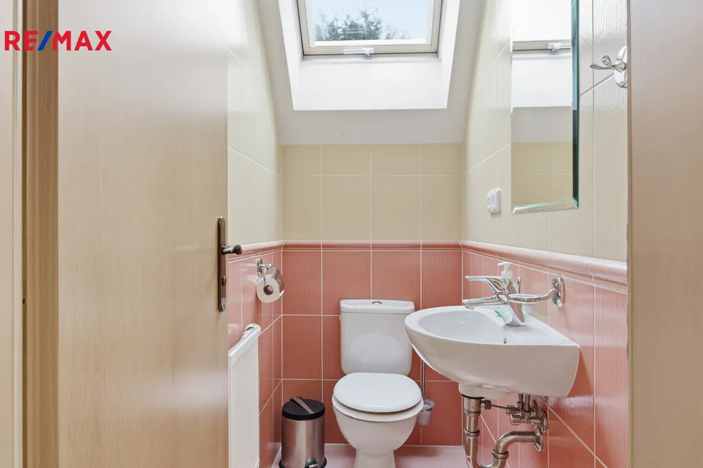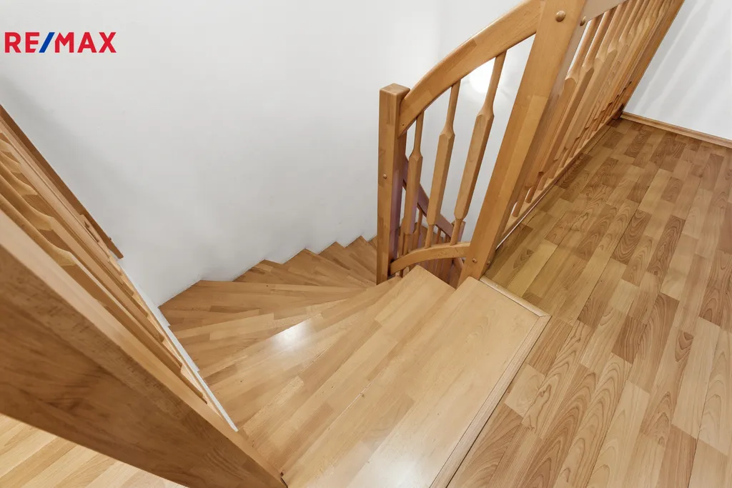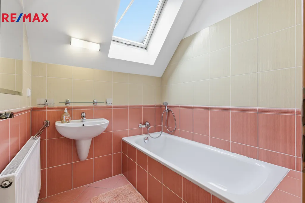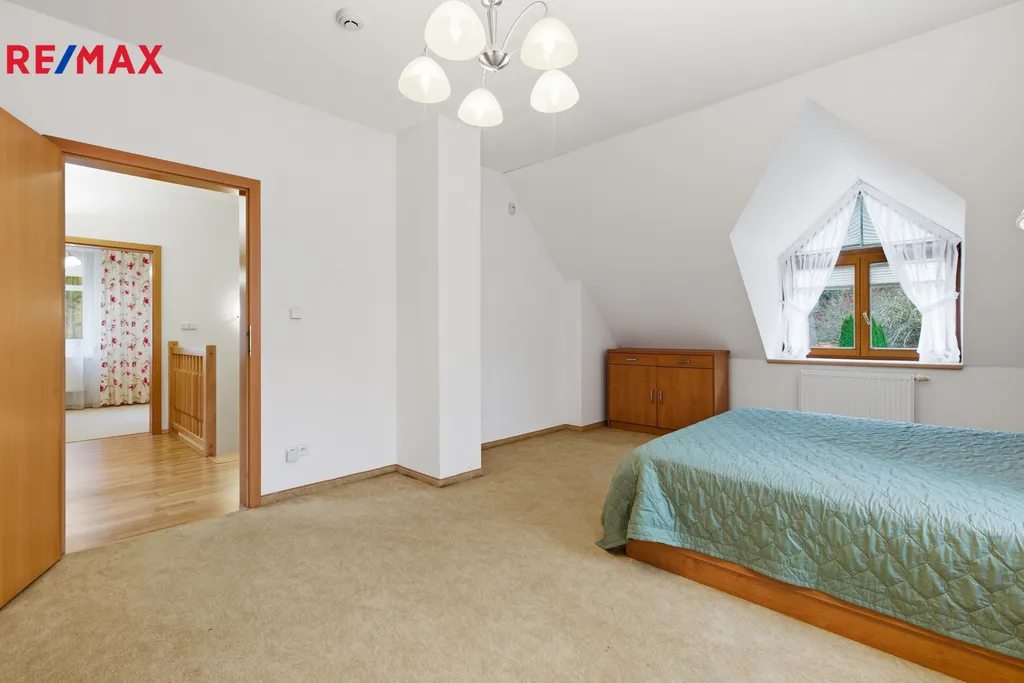 V patře jsou umístěny dvě komfortní ložnice, další koupelna s vanou a samostatná toaleta.