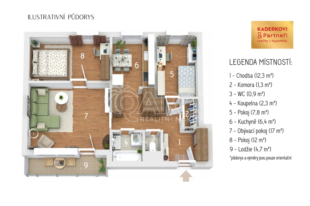 Celková užitná plocha bytu s příslušenstvím je přibližně 67 m² včetně zasklené lodžie o výměře cca 4,7 m² a sklepní kóje o výměře cca 2,3 m².