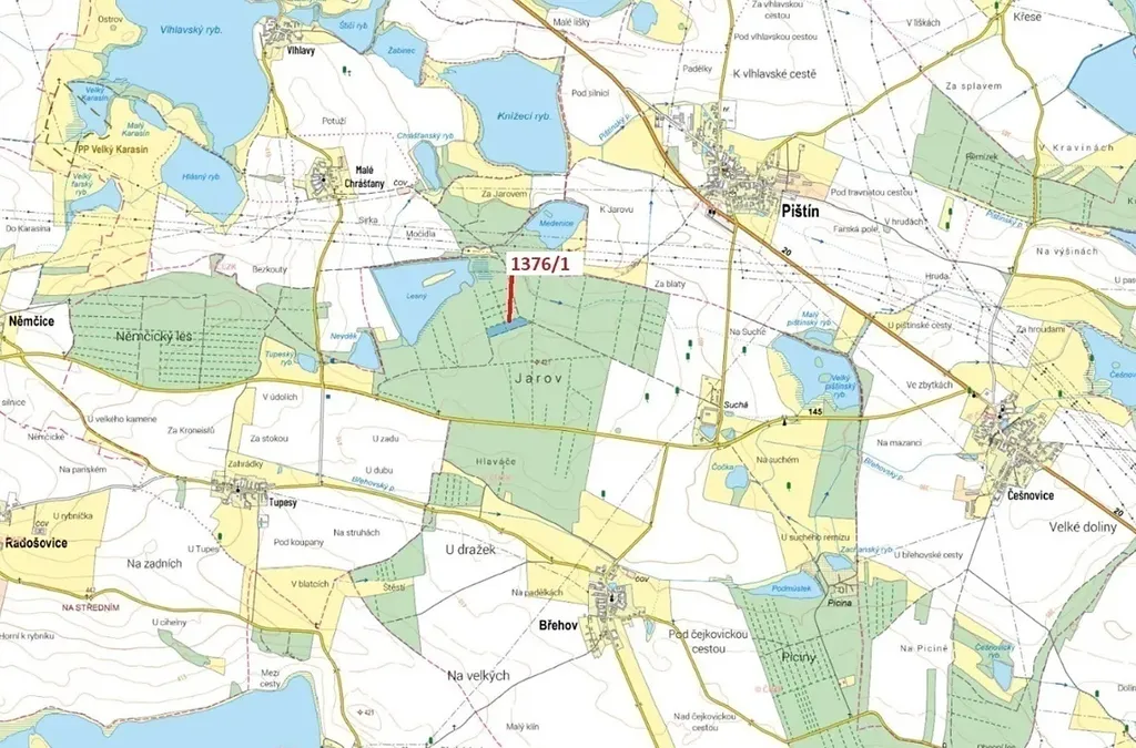 Lesní pozemek o výměře 13 807 m2, parcelní číslo 1376/1, podíl 1/1, katastrální území Břehov, obec Břehov, obec s rozšířenou působností České Budějovice, okres České Budějovice, Jihočeský kraj. Částečně po těžbě.