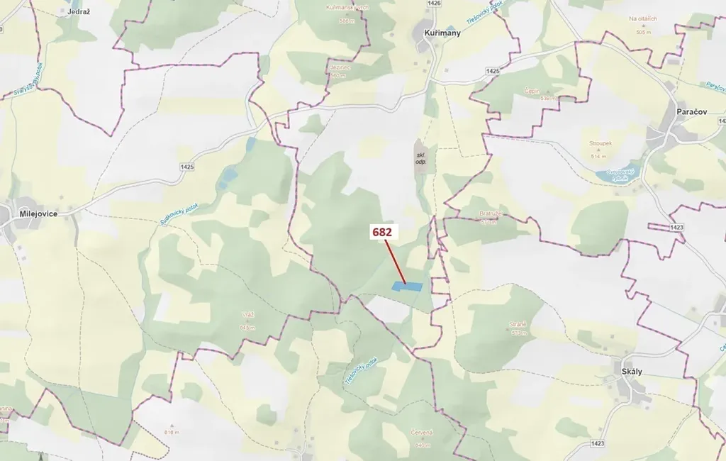 Lesní pozemek o výměře 11 584 m2, parcelní číslo 682, podíl 1/1, katastrální území Kuřimany, obec Kuřimany, obec s rozšířenou působností Strakonice, okres Strakonice, Jihočeský kraj. Po těžbě.