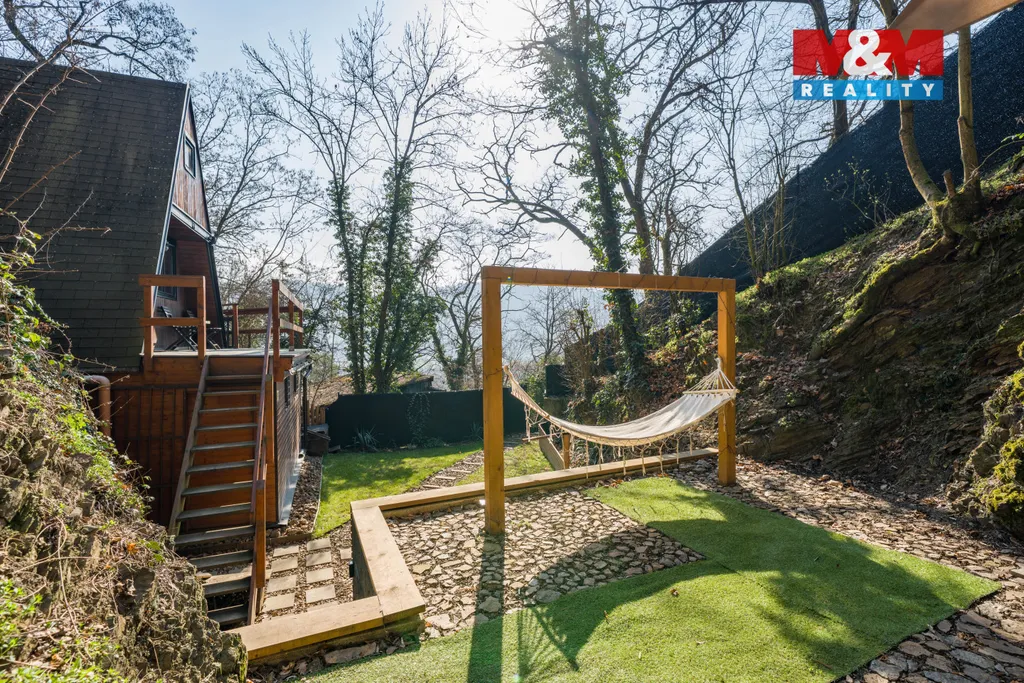 V prvním podlaží se nachází prostorná technická místnost a ve druhém najdete obytnou místnost s kuchyňským koutem se vstupem na terasu a v podkroví je ložnice pro Váš klidný a nerušený spánek. Bonusem je bezesporu možnost relaxace na zahradě v podobě malého, ale dostačujícího bazénu s vířivkou na terase, s houpací sítí, sprchou a grilem s posezením. V horní části zahrady je suchá toaleta a několik záhonků. Z inženýrských sítí se můžete spolehnout na zavedenou elektřinu nejen do chaty, ale rozvedenou i na pozemku, sezónní vodu z veřejného řádu, která je zavedena až na pozemek.