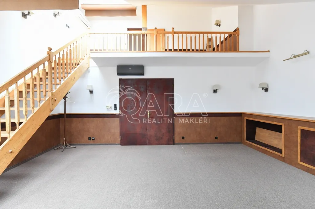 Prostor o celkové výměře 140 m² (vnitřní plocha – 127 m², balkon – 13 m²) je zajímavě dispozičně řešen a tvoří jej: velkorysá vstupní hala, hlavní pokoj se vstupem do patra přes galerii, pokoj (ložnice), koupelna s vanou a WC, kancelář s nábytkem na míru, kuchyně, technická místnost a druhá koupelna s vanou a WC. Z kanceláře a kuchyně je možný vstup na balkon, který je orientován na západ do klidného dvora. Stejnou orientaci okna pak má pokoj v patře. Hlavní pokoj má velkorysá střešní okna orientovaná na opačnou stranu do ulice Spálená s výhledem na střechy okolních domů. Prostor je vybaven klimatizací. Kuchyně je plně vybavená, v pokoji je velká vestavěná skříň. Po obvodu hlavního pokoje je instalován skříňový systém, který poskytuje dostatek úložného prostoru a je zde také zabudovaná výsuvná televize. Podlaha je parketová, ve vstupní hale a v hlavním pokoji zakrytá kobercem, v koupelnách je položena dlažba. Vytápění zajišťuje vlastní plynový kotel, který také ohřívá vodu. Do prostoru je velmi snadný přístup výtahem přímo až ke vstupním dveřím. Součástí nájmu je také garážové stání ve dvoře domu.