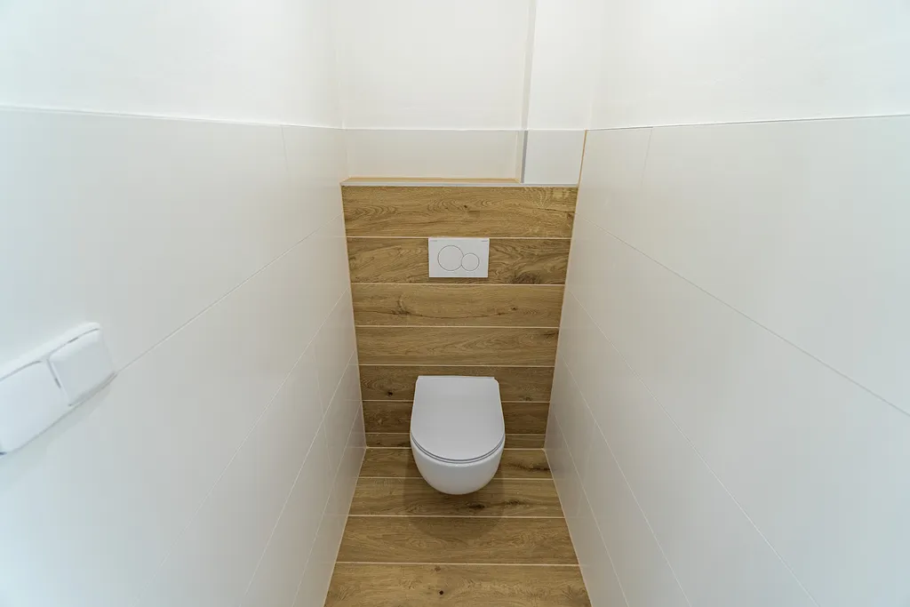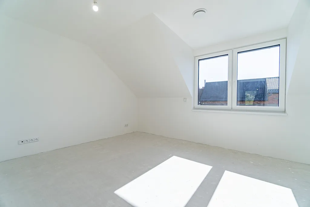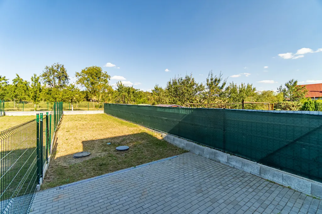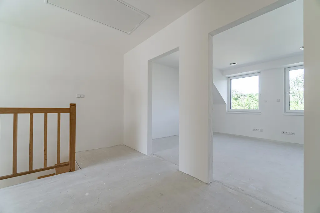 V přízemí domu ze vstupní chodby vejdeme do obývacího pokoje, který je moderně propojen s kuchyní a jídelnou, kde velkým francouzským oknem vstoupíme na terasu a do zahrady. Kuchyň si vybavíte linkou a obklady na míru dle Vašich představ. Vpravo v zádveří domu je místnost, která může sloužit jako pracovna. Dále se z chodby dostaneme do koupelny a na samostatnou toaletu. Prostorná koupelna je vybavena sprchovým koutem, umyvadlem se skříňkou a přípojkou na pračku. Z centrální chodby se schodištěm dostaneme do 1. patra, kde jsou 2 pokoje, z nichž jeden jde upravit na 2 menší samostatné pokoje, které se dají využít jako dětské s výhledem do zahrady, dále ložnice, prostor pro vestavné skříně a koupelna s vanou. V tomto patře si podlahy a obklady v koupelně doladíte dle vlastního vkusu a potřeb. K domu náleží zahrada o výměře 88 m² a dvě parkovací místa.