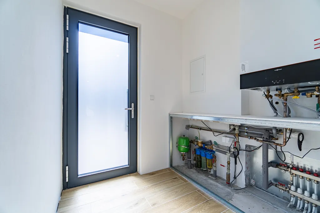 Teplo a teplou vodu zajišťuje kombinovaný plynový kotel, voda a kanalizace je obecní, elektřina 220V a 380V, základy a stropy jsou betonové, svislé konstrukce jsou cihly, tvárnice a cihlové bloky, okna jsou plastová s trojskly, které mají velmi dobré termoizolační a protihlukové vlastnosti, sedlová střecha je zateplená, krytina je plech. Topení je v celém domě podlahové, v koupelnách jsou elektrické topné žebříky, dům je vybavený rekuperací. Nemovitost je napojena na veškeré inženýrské sítě. Na zahradě je retenční nádrž k zadržení dešťové vody.