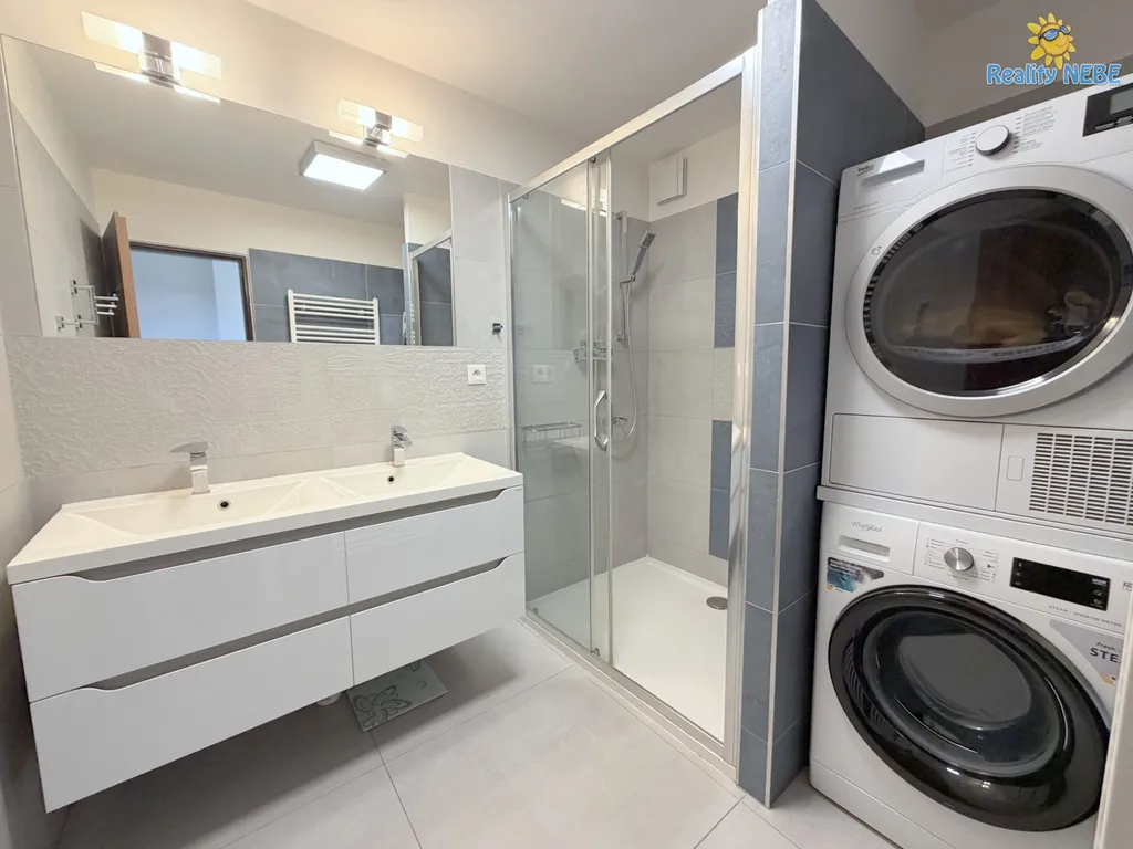 Okolí je velmi klidné, u domu dostatek zeleně, jezírko, dětské hřiště, zastávka MHD a 10minut chůze obchodní centrum.
