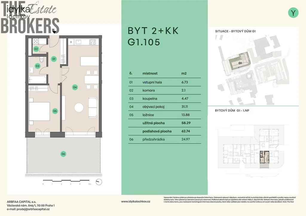 Byt je situován v 1. nadzemním podlaží a nabízí podlahovou plochu 62,74 m² doplněnou o západně orientovanou předzahrádku o velikosti 24,97 m², která poskytuje ideální prostor pro relaxaci, posezení či trávení volného času na čerstvém vzduchu.