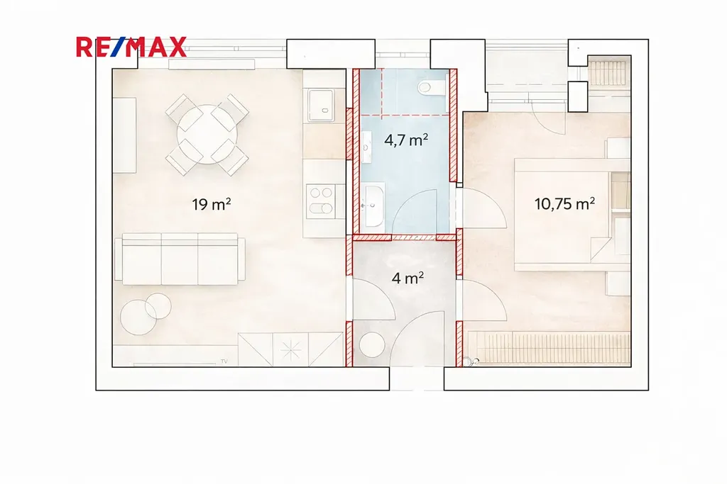 Díky velikosti hlavního pokoje a samostatné kuchyni nabízí byt možnost moderní rekonstrukce například na dispozici 2+kk, kdy může vzniknout samostatná ložnice a obytný prostor s kuchyňským koutem.