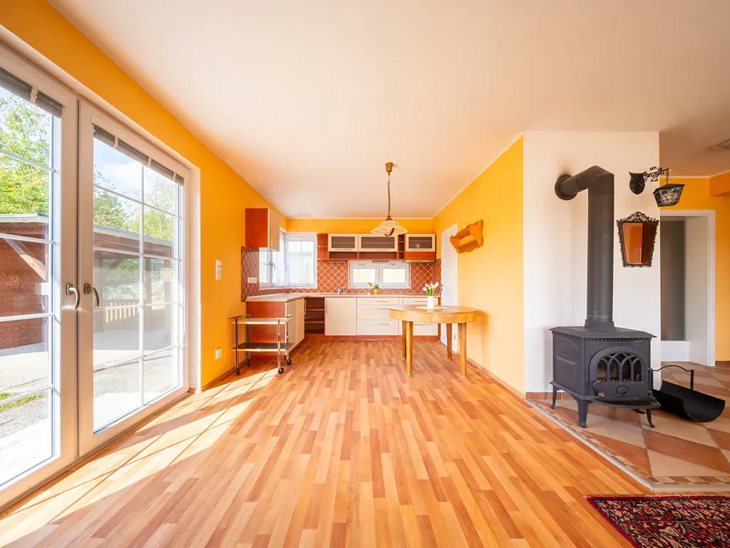 Na krásném a klidném místě s nádherným výhledem. Obývací pokoj s krbovými kamny. Podlahové topení. Ideální velikost pozemku. Hned vedle lázní Luhačovice.