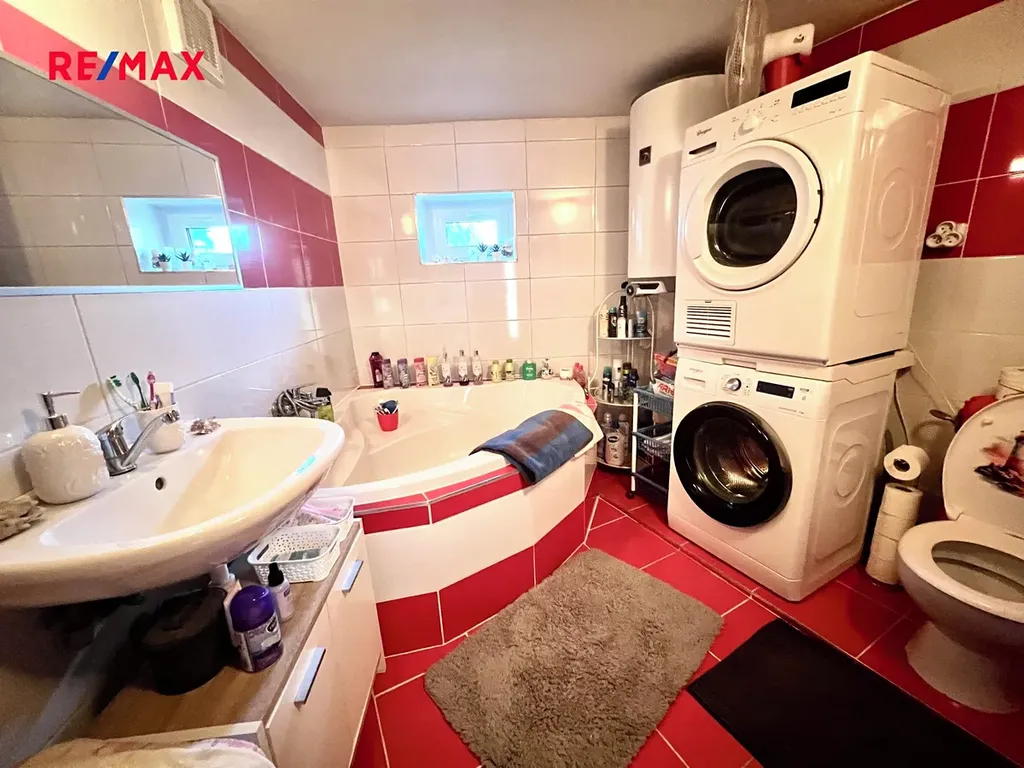 Ve velké koupelně je rohová vana, umyvadlo, toaleta, pračka a sušička, otopný žebřík.