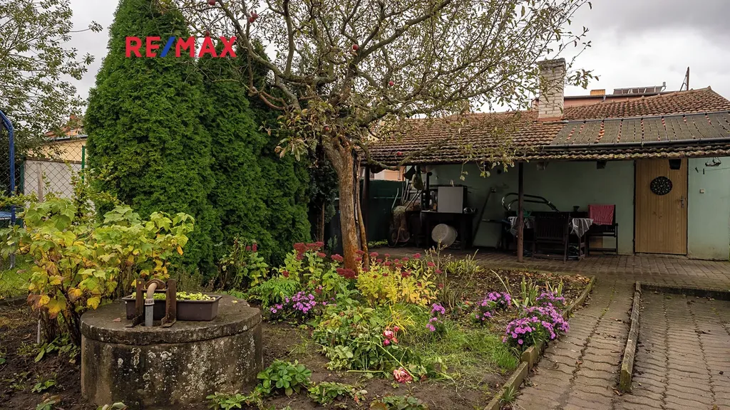 Za domem je uzavřený dvorek s pergolou, ze kterého, přes obecní cestu, vyjdeme na zahradu, kde je umístěna garáž, zastřešené posezení, bazén a užitková zahrada.