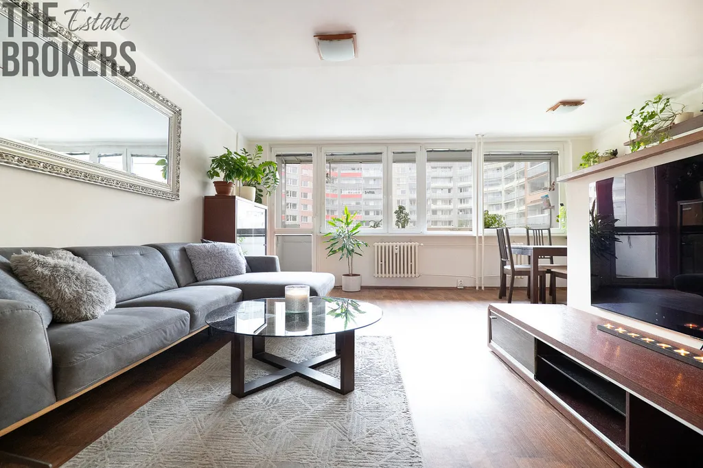 • prostorný obývací pokoj s kuchyňským koutem (31,58 m²) a vstupem na prosklenou lodžii (5,6 m²)