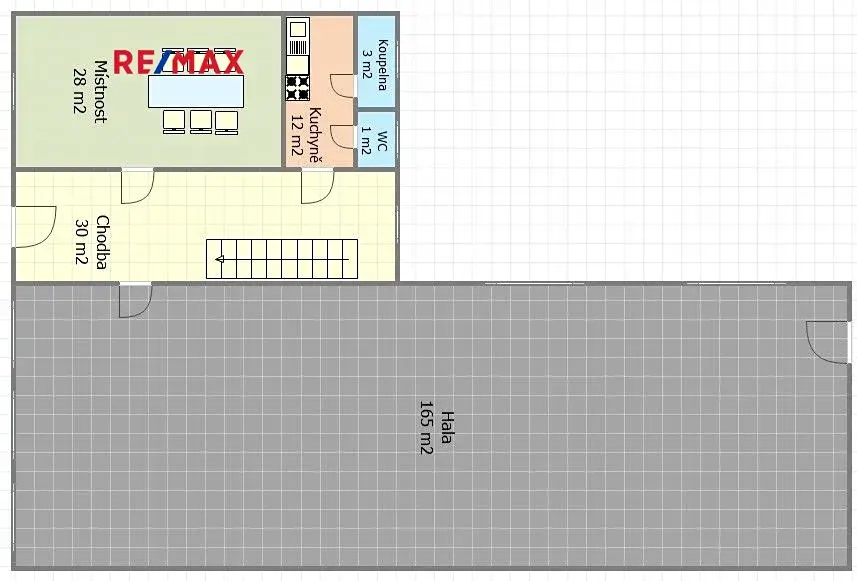 - 1.NP - vstupní chodba, hala 165 m2, místnost 28 m2, kuchyňský kout, sprcha a toaleta,