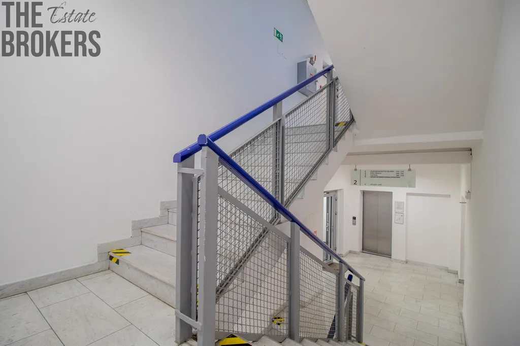 Kancelář o 59,15 m² je příjemně prosvětlená, vybavená kobercem a klimatizací a má plně bezbariérový přístup včetně výtahu. Na patře jsou k dispozici dámské i pánské toalety, ve vrchním patře navíc společná kuchyňka.