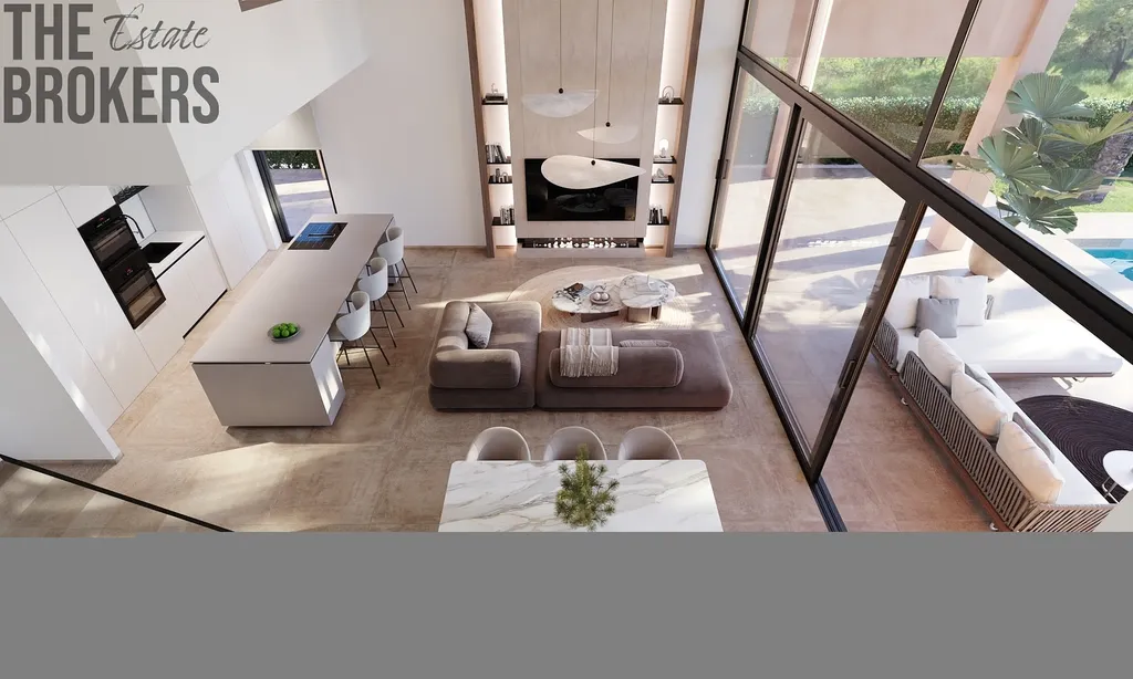 Přízemí: Zahrnuje obývací prostor v otevřeném plánu, který je spojen s jídelní částí a moderní kuchyní. Dále prostornou dvoulůžkovou ložnici s koupelnou en-suite a soukromou terasu. Velké posuvné dveře propojují vnitřní prostor s rozlehlou terasou a upravenou zahradou.
