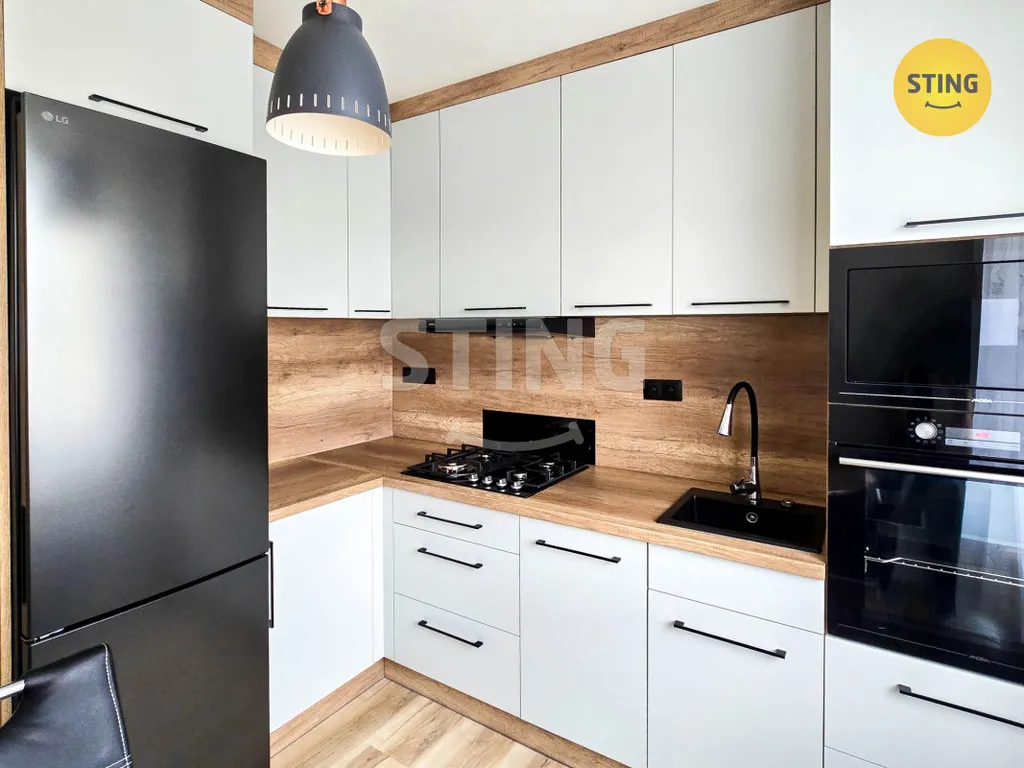 Kuchyň disponuje moderní, vkusnou linkou s dostatkem úložného prostoru, je zde vestavěná myčka nádobí, elektrická i mikrovlnná trouba, digestoř a plynová varná deska. A stále je zde dostatek místa pro jídelní stůl s židlemi a ledničku.