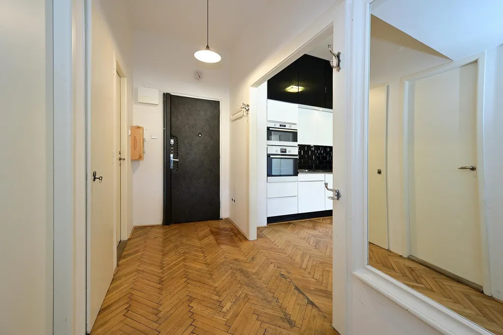 Dominuje obrovský obývací pokoj, který svou centrální polohou dělá z bytu velmi praktické místo k životu. Velká okna poskytují dostatek světla a pocit lehkosti. Dále velká koupelna, oddělená toaleta, praktická šatna. Ideální pro rodinu.