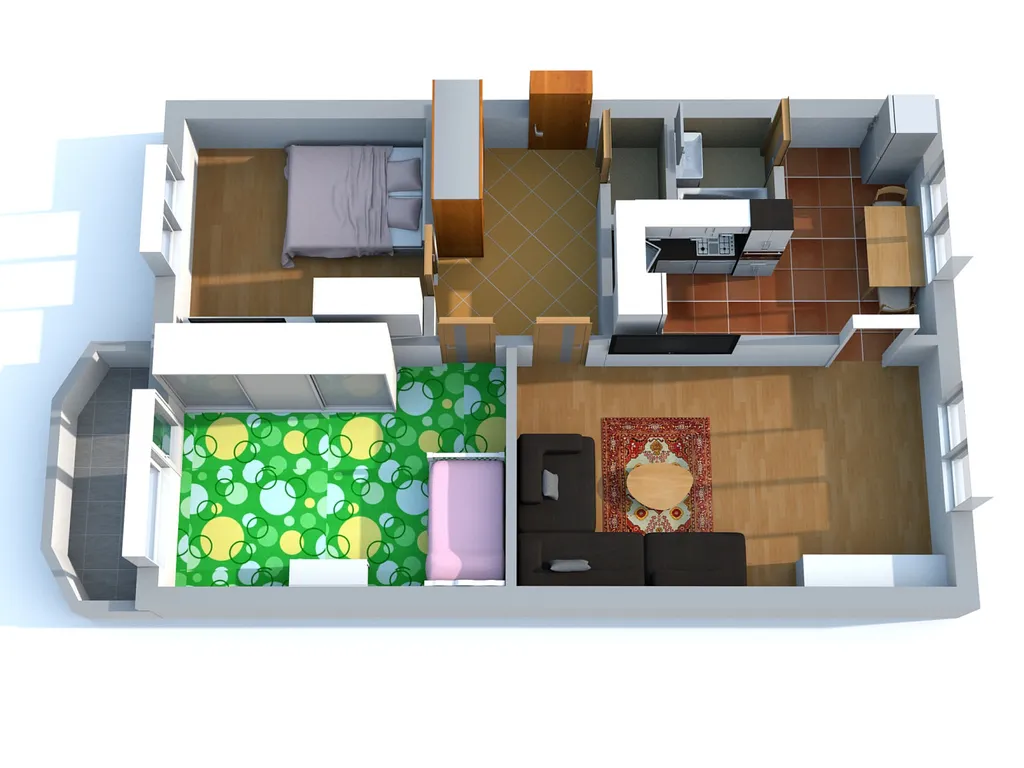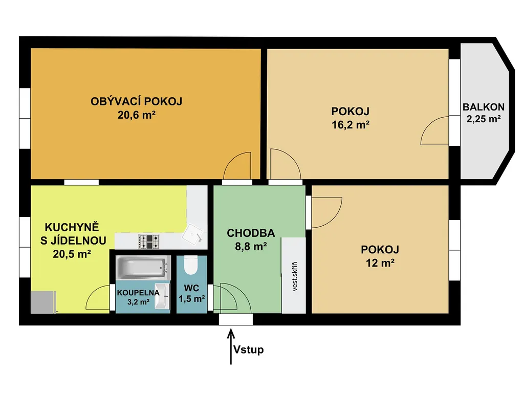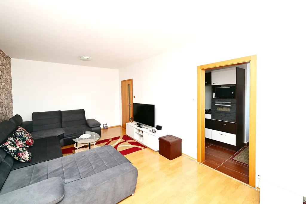 Byt je prakticky uspořádán a disponuje velkou vstupní chodbou s vestavěnou skříní (8,8 m²), obývacím pokojem (20,6 m²), dvěma neprůchozími pokoji ( 12 a 16,2 m²), kuchyní s jídelnou (20,5 m²), koupelnou a samostatným WC.