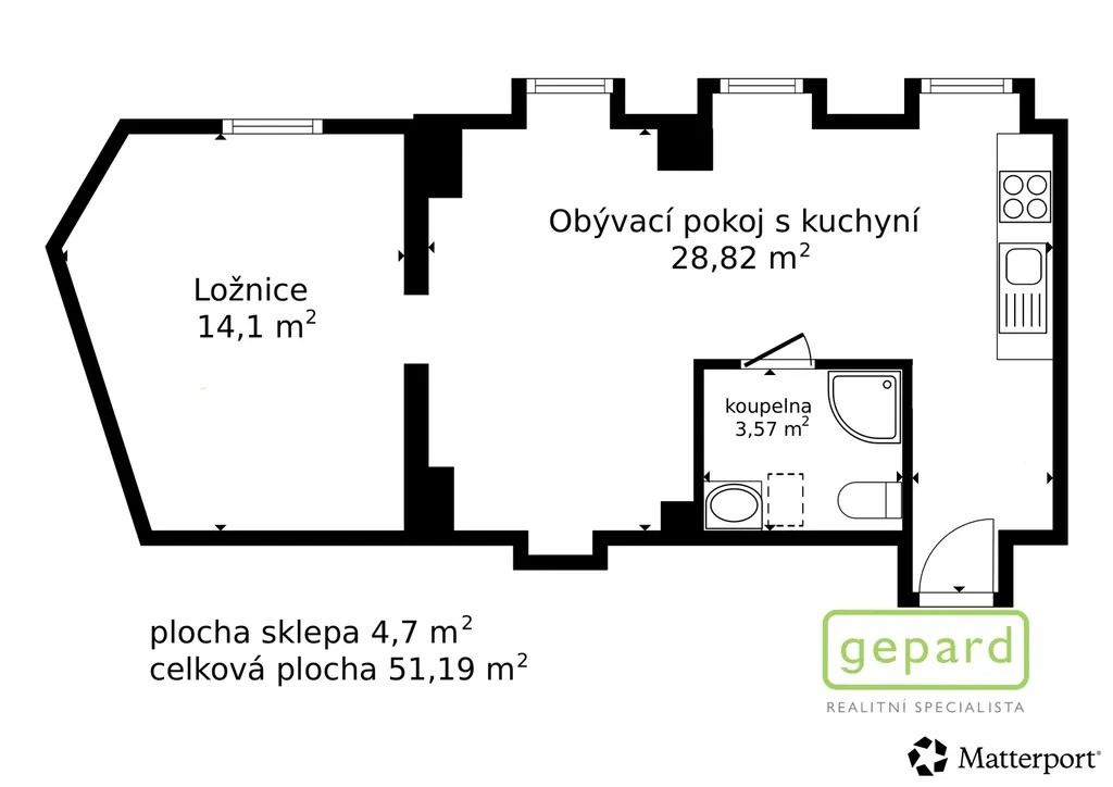 Podlahová plocha bytu je 47 m². K bytu náleží sklep o výměře 4,7 m².