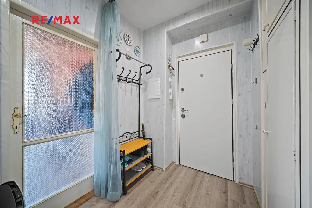 V prostorné vstupní chodbě (14,5m2) byla vybudována kuchyně, byt má tedy nyní další 2 ložnice a obývací pokoj.