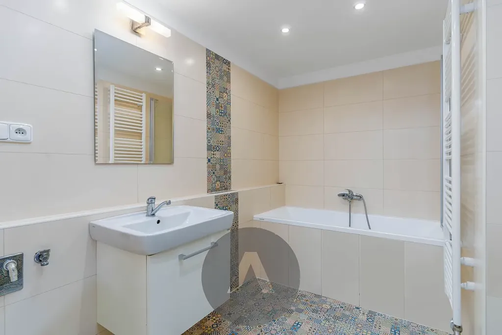 V koupelně se nachází vana, umyvadlo, zrcadlo, otopný žebřík a přípojka na pračku.